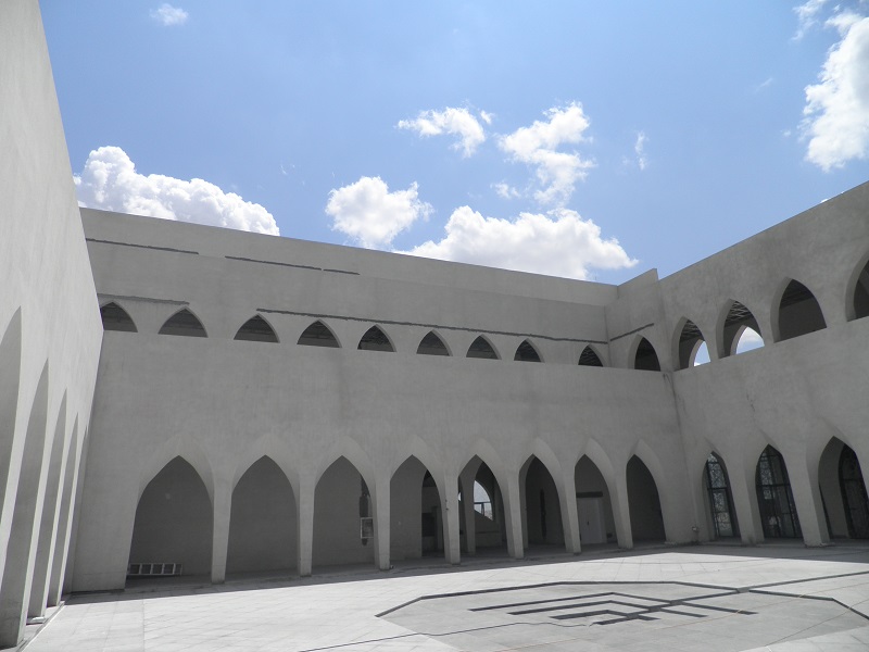 與禮拜殿相連的雙層環廊設計,通過一系列的拱形門柱,將庭院緊密環抱。門柱的拱形在延續13-15世紀建筑風格的基礎上,又加以了創新,門拱如扭曲的柳葉,形成自然曲面,朝向庭院。潔白的環廊與麻石地面,所構成的機理對比,給人以莊嚴、樸實的印象。37m高的宣禮塔同樣采用運用了同構原理,將鋼結構三棱柱體以幾何關系層層遞減,塔頂的寶瓶和月牙形裝飾物,與禮拜殿穹頂上的標志遙相呼應,構成伊斯蘭教"彎月涵星"象征。