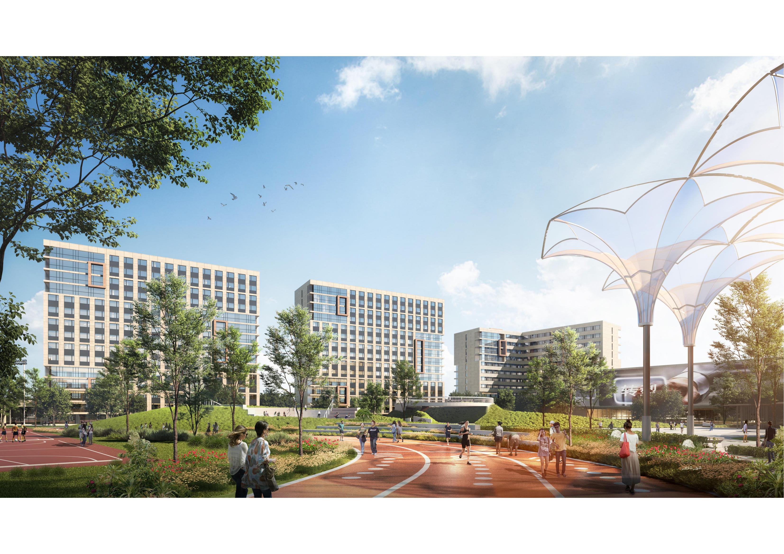 生活區景觀以“玉如意”為意向,勾勒出學生活動場地、體育運動場地、集會休閑場地等形象,連接東西地塊,營造了活潑怡人的生活氛圍。